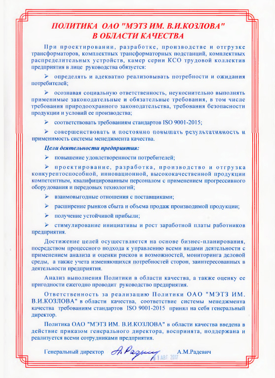 Система менеджмента качества проектирования, разработки, производства и отгрузки продукции сертифицирована международным органом по сертификации — “DEKRA”, Германия — на соответствие МС ISO 9001: 2015 и национальным органом по сертификации — БелГИСС — на соответствие СТБ ISO 9001-2015.